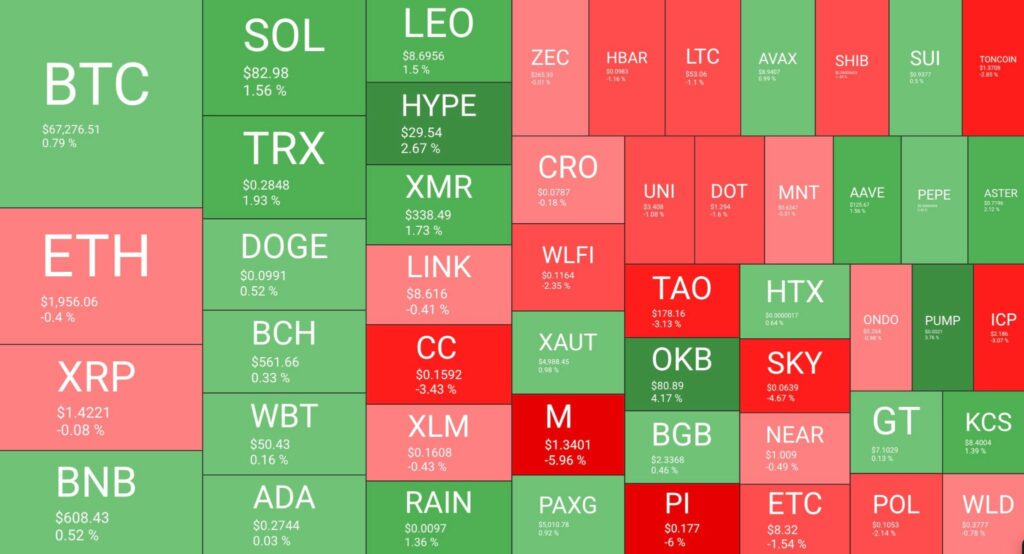 สภาวะตลาดคริปโตเคอร์เรนซีในรอบ 24 ชั่วโมงที่ผ่านมาเต็มไปด้วยความผันผวน ราคา Bitcoin ร่วงดิ่งลงอย่างรุนแรงก่อนจะมีแรงซื้อดึงกลับขึ้นมาซื้อขายกันที่ระดับ 67,200 ดอลลาร์ หรือเพิ่มขึ้นประมาณ 0.77% แรงกระเพื่อมนี้ไม่ได้ทำให้ทุกเหรียญสดใสตามไปด้วย เพราะหลายโปรเจกต์ยังคงจมกองเลือดและไม่สามารถฟื้นตัวได้ตามพี่ใหญ่อย่าง Bitcoin นักลงทุนทั่วโลกกำลังตกอยู่ในสภาวะเฝ้าระวัง เนื่องจากวันนี้มีปัจจัยชี้ชะตาที่ถาโถมเข้ามาพร้อมกัน ทั้งด้านพื้นฐานเครือข่าย ตัวเลขเศรษฐกิจมหาภาค และสภาวะความตึงเครียดระดับโลก