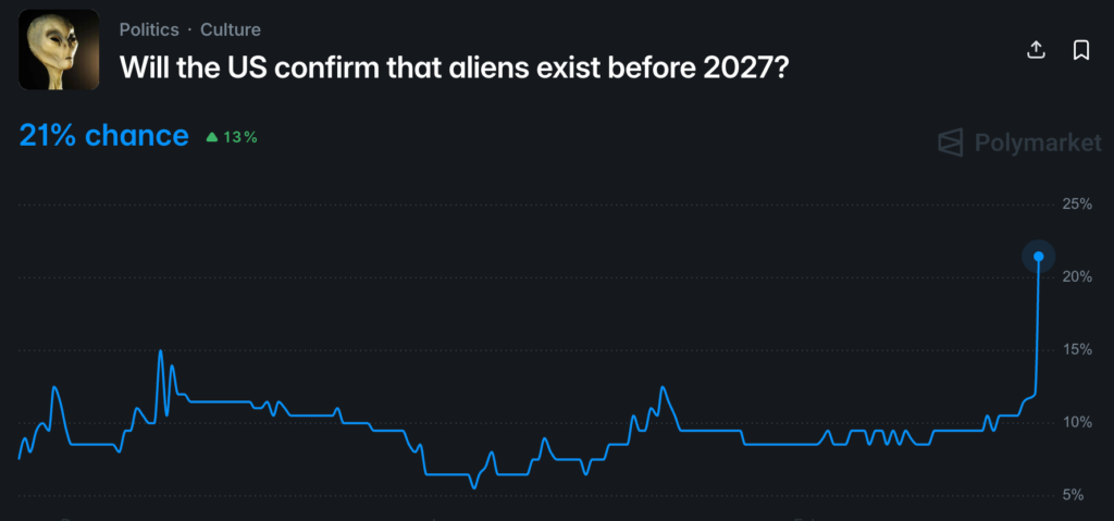 ขณะเดียวกันความเป็นไปได้ที่สหรัฐฯจะเปิดเผยว่า เอเลี่ยนมีจริงก่อนปี 2027 บนตลาดพยากรณ์ Polymarket ยังทะยานขึ้นสูงอย่างรวดเร็วหลังทรัมป์พูดถึงเรื่องนี้ด้วยตนเอง