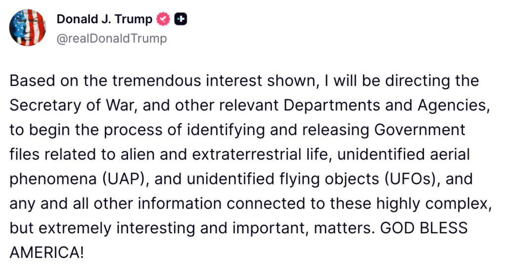 อ้างอิงจากโพสต์บนแพลตฟอร์มโซเชียลมีเดีย ทรัมป์ กล่าวว่า เขาจะสั่งการให้รัฐมนตรีว่าการกระทรวงกลาโหมและเจ้าหน้าที่ส่วนอื่นๆ เริ่มกระบวนการระบุตัวตนและเปิดเผยไฟล์เอกสารของรัฐบาลที่เกี่ยวข้องกับสิ่งมีชีวิตนอกโลกและเอเลี่ยน, ปรากฏการณ์ทางอากาศที่ไม่สามารถระบุได้ (UAP) และวัตถุบินที่ไม่สามารถระบุได้ (UFO) ตามคำเรียกร้องและความสนใจของประชาชน แต่ตัวเขาเองไม่รู้เหมือนกันว่าเอเลี่ยนมีจริงไหม