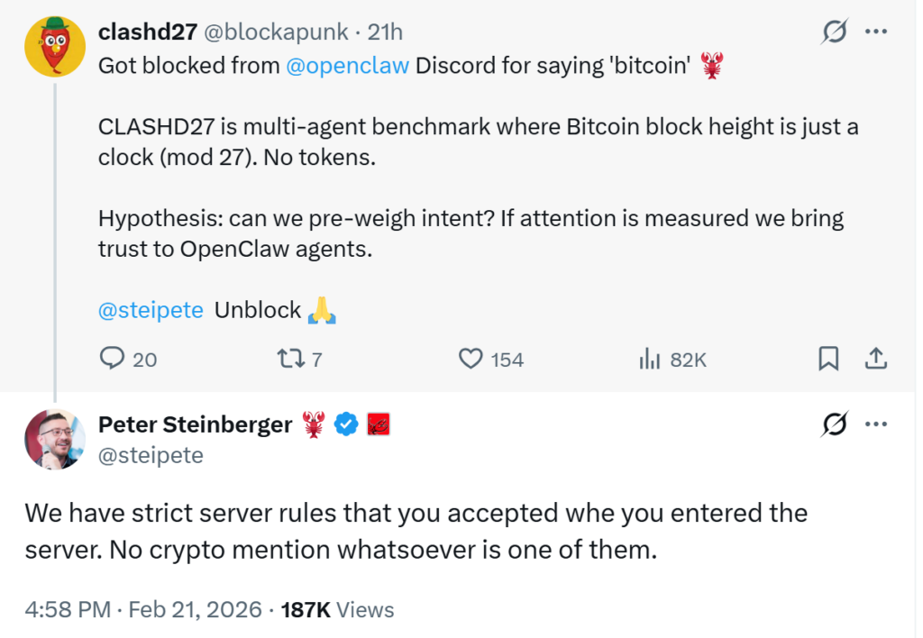 ผู้ใช้งานรายหนึ่งได้ออกมาโวยผ่านโซเชียลมีเดียว่า ตัวเขาถูกแบบนออกจากเซิร์ฟเวอร์ Discord ของ Openclaw เพียงเพราะ AI ที่ใช้มีการกล่าวถึง Bitcoin ภายในประโยคธรรมดา ไม่ได้โปรโมทเหรียญอะไร ซึ่งไม่น่าจะใช่เรื่องใหญ่แต่กลับต้องโทษสถานหนัก จึงได้ทำการเรียกร้องให้ Peter Steinberger ผู้สร้างทำการปลดแบน