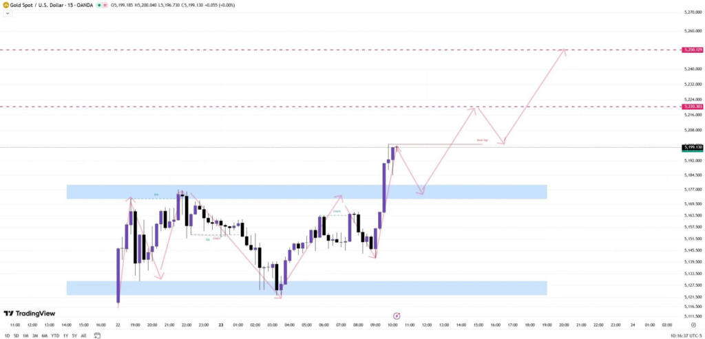 การที่ราคาสามารถเบรกทะลุแนวต้าน 5,180 ดอลลาร์ขึ้นมาได้ เป็นการยืนยันความแข็งแกร่งของฝั่งซื้อ โดยมีด่านทดสอบถัดไปรออยู่ที่ 5,220 และ 5,250 ดอลลาร์ ตามลำดับ หากราคายังสามารถประคองตัวยืนเหนือ 5,180 ดอลลาร์ได้ ทิศทางระยะสั้นก็จะยังคงเป็นบวกต่อไป แต่หากหลุด 5,150 ดอลลาร์ลงมา อาจต้องกลับไปตั้งหลักพักตัวกันอีกรอบ