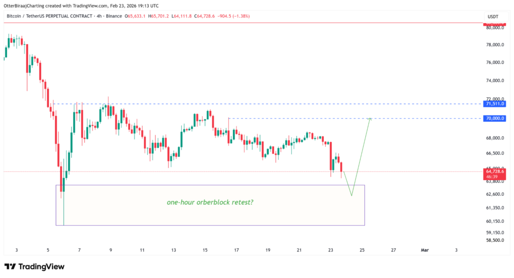 ราคา Bitcoin (BTC) ปรับตัวลงแตะ $64,111 ในช่วงตลาดสหรัฐฯ เมื่อวานนี้ (23 ก.พ.) ทำสถิติต่ำสุดในรอบสัปดาห์ ทว่าภาพรวมราคายังคงแกว่งตัวในกรอบ $65,000 – $71,000 ที่ดำเนินมาตลอด 3 สัปดาห์ โดยนักวิเคราะห์มองว่า นี่อาจเป็นเพียงการสลัดรายย่อยทิ้งก่อนขึ้นต่อ