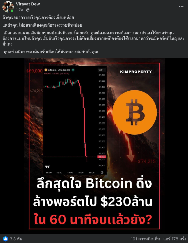 - ช่วงหลังมานี้ คุณดิว วีรวัฒน์ ออกมาแสดงมุมมองเกี่ยวกับทิศทางราคา Bitcoin บ่อยขึ้น โดยล่าสุดออกมาโพสต์เรียกสติในช่วงที่ราคาทุบลงแรง