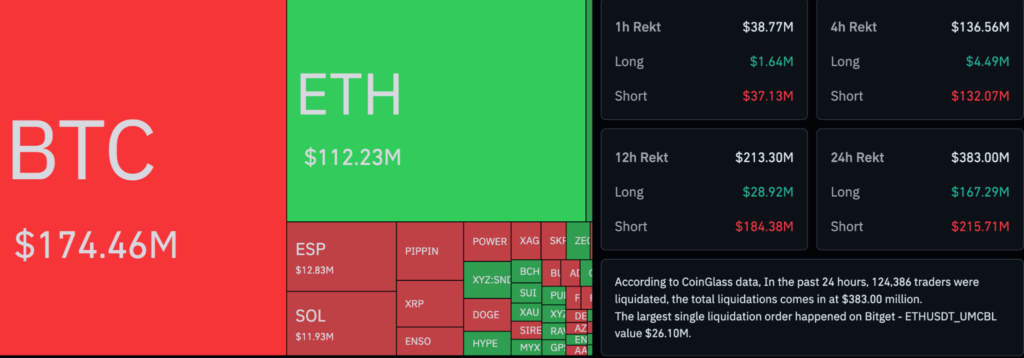 เมื่อราคาวิ่งสวนทางกับความคาดหวังของฝั่งขาลง เทรดเดอร์ที่เปิดสถานะชอร์ตไว้จึงถูกบังคับปิดโพสิชันอย่างหลีกเลี่ยงไม่ได้ โดยข้อมูลจาก Coinglass ระบุว่า ในช่วง 24 ชั่วโมงที่ผ่านมาเกิดความเสียหายในตลาดฟิวเจอร์สกว่า $383 ล้านดอลลาร์ กลายเป็นปรากฏการณ์ชอร์ตสควีซที่ดันราคาบิตคอยน์ให้พุ่งทะลุแนวต้านสำคัญไปอย่างง่ายดายราวกับติดจรวด