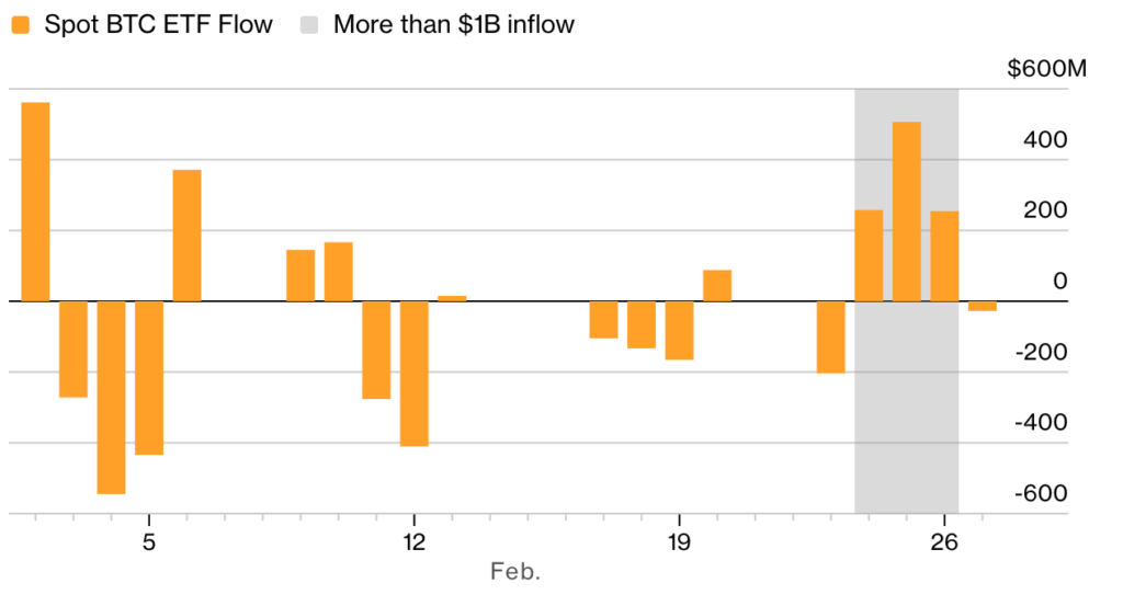 Hughes แนะนำว่า ตัวเลขการไหลเวียนของกองทุน Bitcoin ETF จำเป็นตัวเลขสำคัญที่สุดในช่วงเวลาขณะนี้ เพราะในช่วงที่ผ่านมามีเงินไหลเข้าอย่างต่อเนื่องถึง $1 พันล้าน ถ้าเปิดตลาดมาแล้วพบว่าเงินเลือกที่จะไหลออกอาจทำให้ Bitcoin ดิ่งกลับไป $63,000