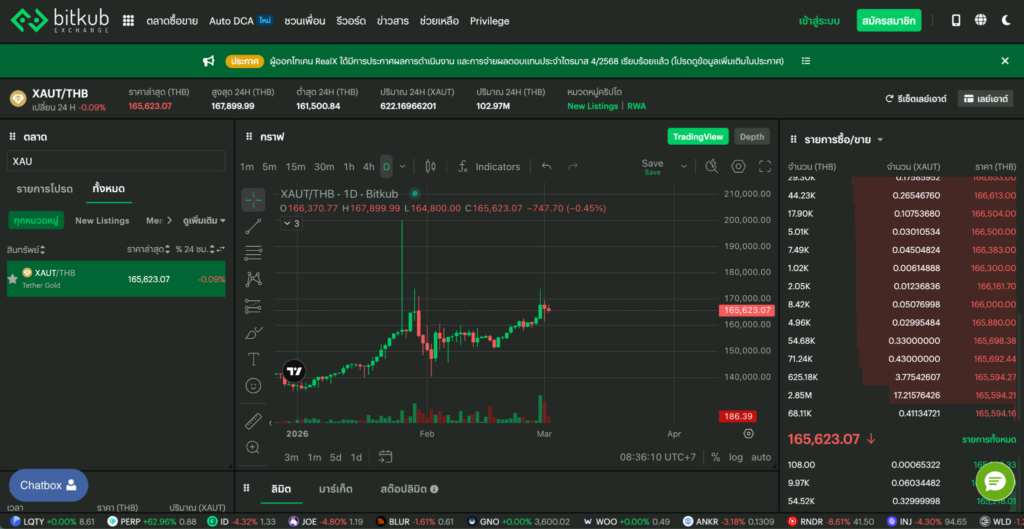 จากการตรวจสอบข้อมูลบนกระดานเทรด Bitkub Exchange ณ เวลา 08:35น. ประจำวันที่ 2 มีนาคม 2569 พบว่าราคาสินทรัพย์ทองคำดิจิทัลมีการเคลื่อนไหวที่น่าสนใจ โดยราคาปัจจุบันแตะ 165,623 บาท