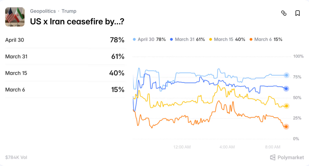 • นักเดิมพันส่วนใหญ่มองสถานการณ์จะคลี่คลายเร็ว โดยตลาดได้ทำนายการหยุดยิงก่อนสิ้นเดือนมีนาคมพุ่งสูงถึง 61%