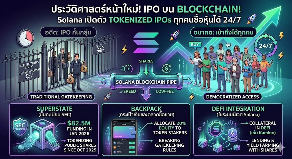 Solana ประกาศความร่วมมือกับ Backpack และ Superstate เพื่อนำ tokenized IPOs มาสู่ blockchain ครั้งแรก ทำให้ทุกคนสามารถซื้อหุ้นบริษัทที่กำลังจะ IPO ได้โดยตรงผ่าน crypto wallet โดยไม่ต้องเป็นนักลงทุนระดับสูงหรือมีเงินทุนมหาศาล