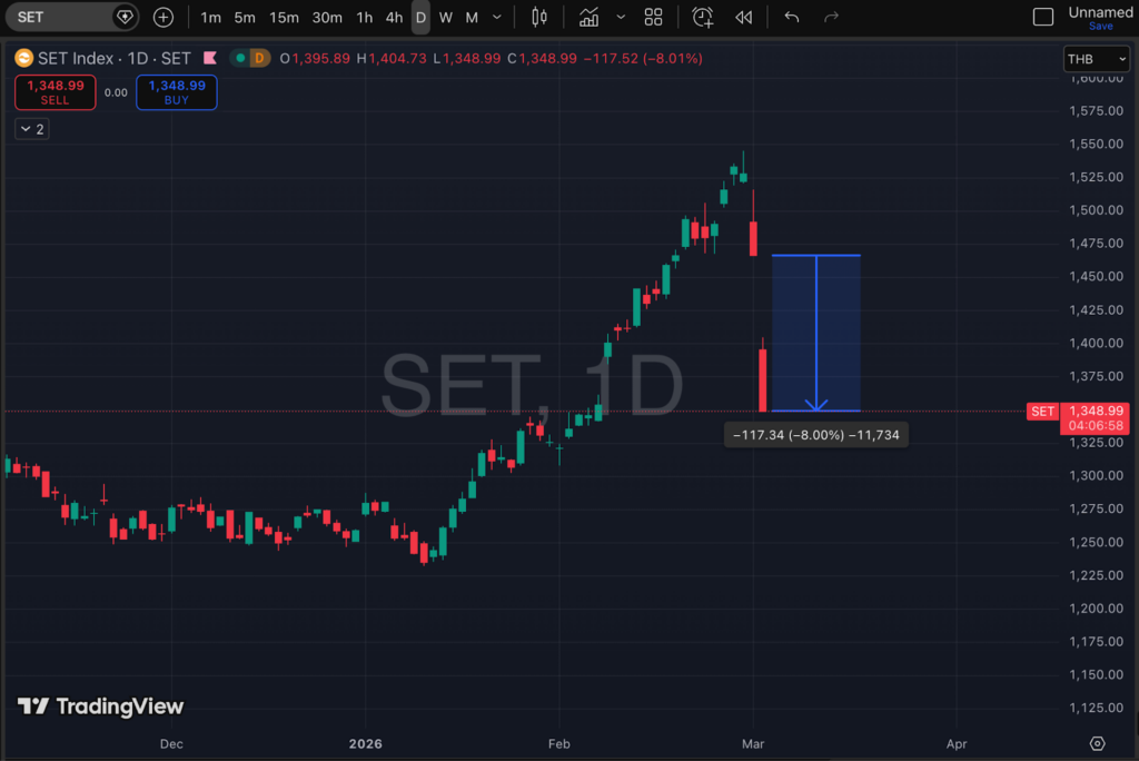 วันนี้ (4 มี.ค. 69) ตลาดหุ้นไทยหนีไม่พ้นแรงกระแทกจากไฟสงคราม ดัชนี SET เผชิญแรงเทขายกระหน่ำดิ่งลงกว่า 117.52 จุด หรือติดลบไปถึง 8.01% ทรุดลงไปกองที่ 1,348.99 จุด สถานการณ์ดังกล่าวบีบให้ตลาดหลักทรัพย์ฯ ต้องงัด Circuit Breaker หรือมาตรการหยุดพักการซื้อขายชั่วคราวมาใช้ทันที โดยระบบจะกลับมาเปิดให้ทำการซื้อขายกันอีกครั้งในช่วงบ่ายวันนี้