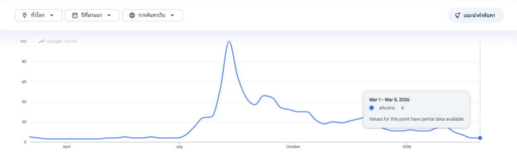 ขณะที่ Google Trends ยิ่งตอกย้ำภาพความเงียบเหงา ด้วยคะแนนการค้นหาคำว่า “altcoins” ที่เหลือเพียง 4 จาก 100 คะแนนเต็ม ซึ่งลดลงจากระดับสูงสุดในช่วงกลางปีที่ผ่านมาอย่างน่าใจหาย