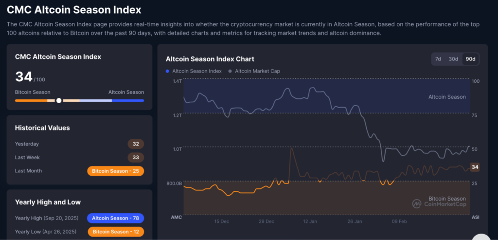 ปัจจุบันดัชนี Altcoin Season Index จาก CoinMarketCap อยู่ที่ระดับ 34 ซึ่งหมายความว่า เหรียญ 100 อันดับแรก ส่วนใหญ่ยังทำผลงานได้แย่กว่า Bitcoin ในรอบ 90 วันที่ผ่านมา