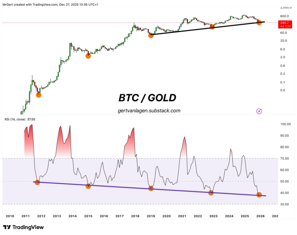 สัญญาณตัวสุดท้ายมาจากมุมมองทางเทคนิค หากเราพิจารณากราฟสัดส่วน GOLDBTC บน TradingView นักวิเคราะห์ชื่อดัง Gert van Lagen ได้เน้นย้ำถึงความน่าสนใจของค่า RSI