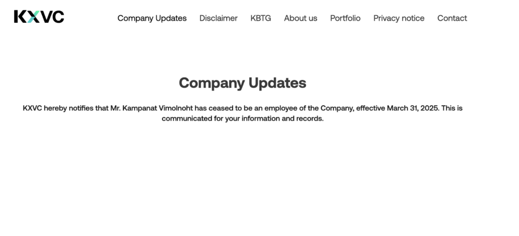 • KXVC กองทุนร่วมทุนในเครือ KBTG กลุ่มบริษัทเทคโนโลยีของกสิกรไทยประกาศเตือนภัย กรณีอดีตผู้บริหาร “กัมปนาท วิมลโนท” แอบอ้างชื่อบริษัทระดมทุน ยืนยันพ้นสภาพพนักงานไปตั้งแต่วันที่ 31 มีนาคม 2568