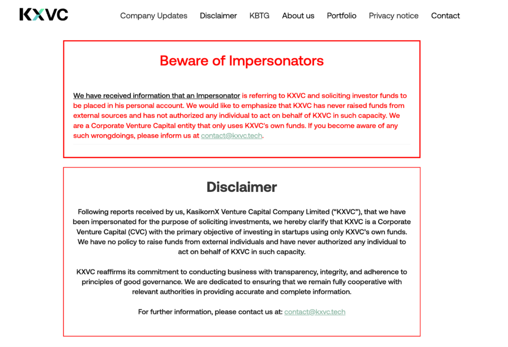 บริษัท กสิกรเอกซ์ เวนเจอร์ แคปิทัล (KXVC) กองทุนในเครือ KBTG ของธนาคารกสิกรไทย ออกประกาศเตือนภัยนักลงทุนอย่างเป็นทางการ หลังพบกรณีอดีตผู้บริหารระดับสูงแอบอ้างชื่อและตำแหน่งหน้าที่ในการหลอกระดมทุนจากบุคคลภายนอก