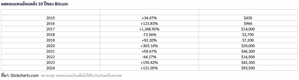 แม้ว่าในรอบ 10 ปีที่ผ่านมาจะมีปีที่ขาดทุนหนักถึงสองปีคือปี 2018 ที่ติดลบ -73.56% และปี 2022 ที่ติดลบ -64.27% แต่ในปีที่กำไรก็ทำผลตอบแทนมหาศาลจนชดเชยและยังบวกมากกว่านั้นอีก ยกตัวอย่างเช่น ถ้าคุณซื้อ Bitcoin เมื่อวันที่ 9 มีนาคม 2016 ที่ราคา $411 และถือมาจนถึงวันนี้ที่ราคา $67,699 จะคิดเป็นผลตอบแทนสูงถึง 16,000% เลยทีเดียว