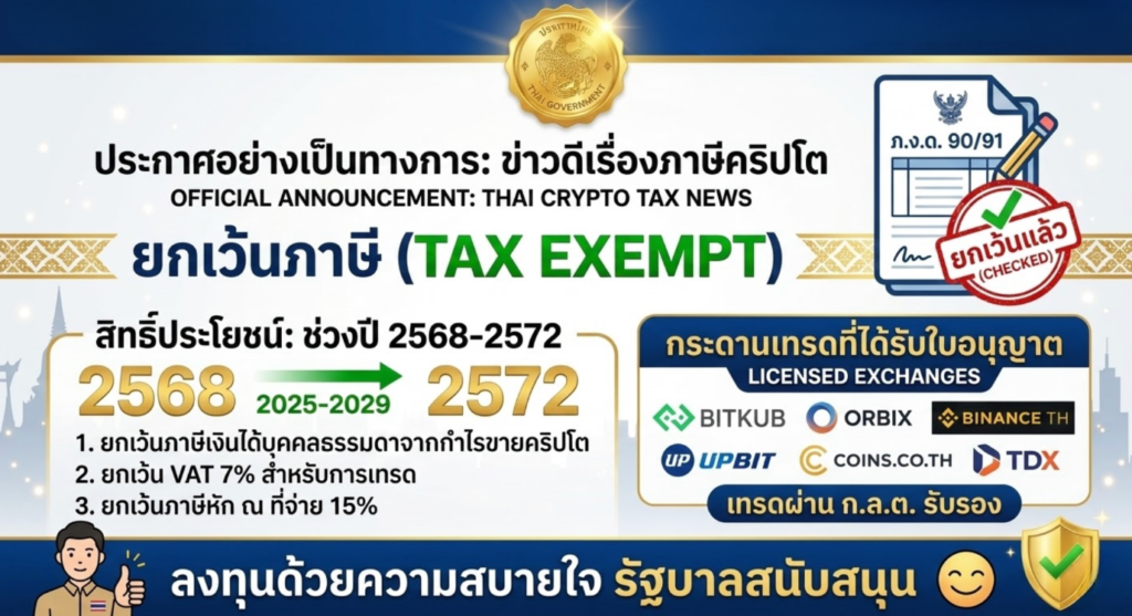 เรื่องนี้เป็นข่าวดีมากสำหรับนักลงทุนชาวไทย เมื่อวันที่ 17 มิถุนายน 68 คณะรัฐมนตรีมีมติเห็นชอบยกเว้นภาษีเงินได้บุคคลธรรมดาสำหรับกำไรจากการขายคริปโตเคอร์เรนซี โดยมีผลตั้งแต่ 1 มกราคม 68 จนถึง 31 ธันวาคม 72 เพื่อผลักดันให้ไทยเป็นศูนย์กลางสินทรัพย์ดิจิทัล