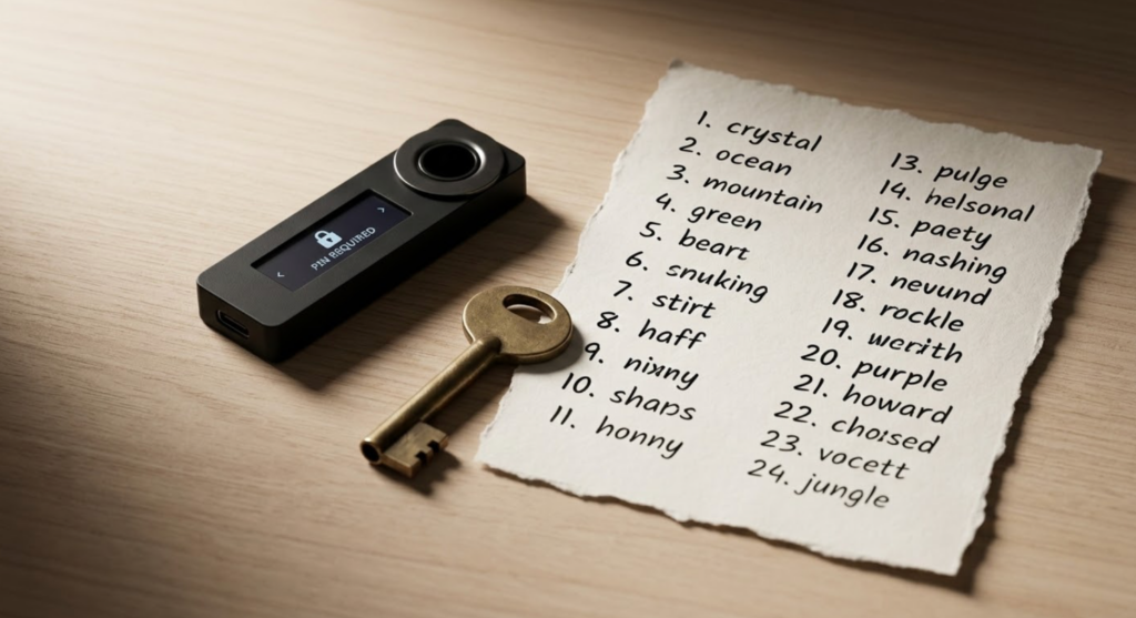 สำหรับการใช้ Hardware Wallet คุณต้องซื้อเครื่องจากเว็บไซต์ทางการเท่านั้น ห้ามซื้อมือสองเด็ดขาดเพื่อป้องกันการถูกดัดแปลง เมื่อได้เครื่องมาและตั้งค่าเสร็จ ให้จดบันทึก Seed Phrase 24 คำลงบนกระดาษ ห้ามบันทึกไว้ในโทรศัพท์หรือออนไลน์เด็ดขาด และควรเก็บกระดาษแผ่นนี้ไว้ในตู้เซฟหรือแยกเก็บสองแห่งที่ปลอดภัย