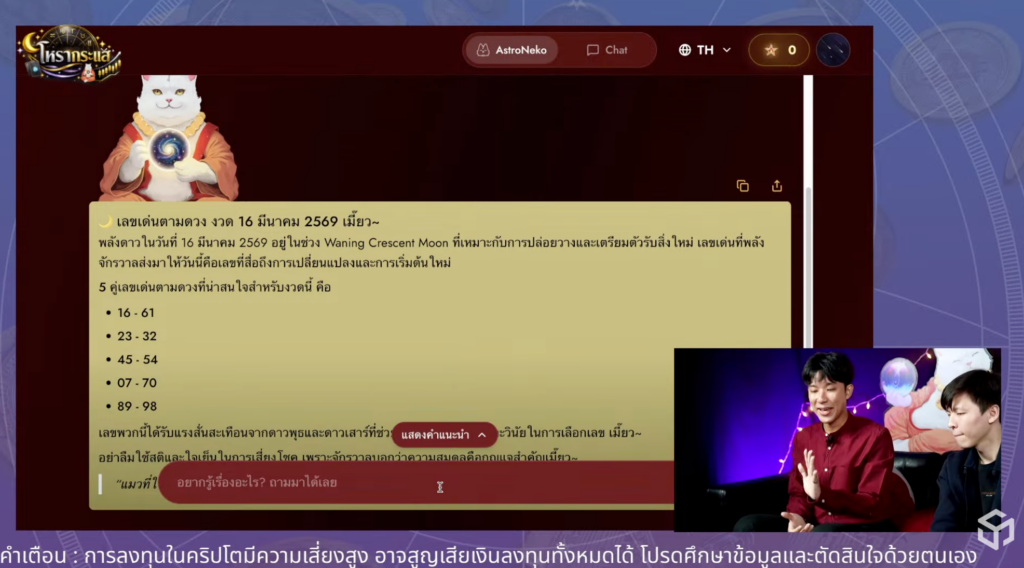 ในรายการไลฟ์สด ‘โหรากระแส’ Ep.1 เมื่อวันที่ 11 มี.ค.ที่ผ่านมา เรียกได้ว่าสร้างความฮือฮาให้กับเหล่านักเสี่ยงโชคไม่น้อย เพราะในไลฟ์ได้มีการใช้งาน AI ที่มีชื่อว่า “AstroNeko” มาทำนายเลขเด็ดของหวยประจำงวด 16 มี.ค. 69 ซึ่งเป็นงวดล่าสุดที่กำลังจะถึง