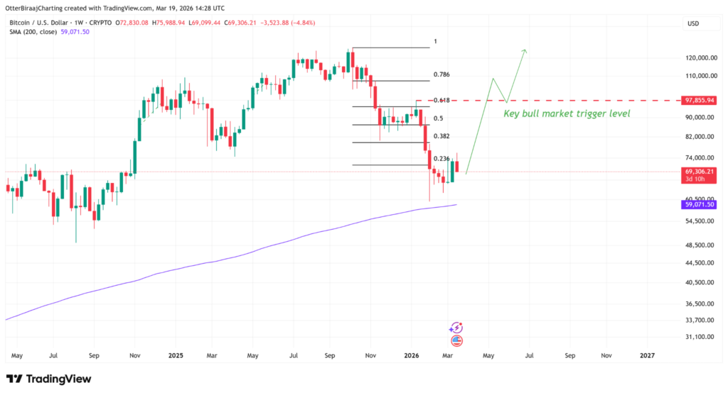 ราคา BTC/USDT ในกราฟรายสัปดาห์ แหล่งที่มา: Cointelegraph/TradingView