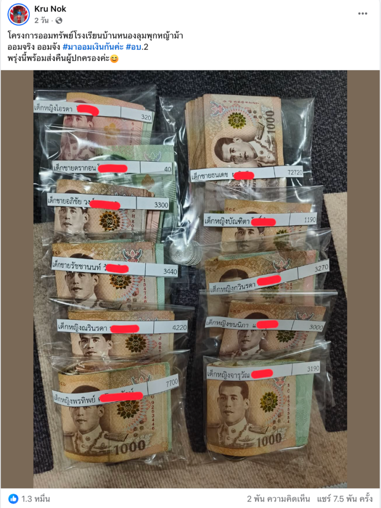 ในโพสต์ของคุณครูระบุข้อความประกอบภาพว่า “โครงการออมทรัพย์โรงเรียนบ้านหนองลุมพุกหญ้าม้า ออมจริง ออมจัง พร้อมเตรียมส่งมอบเงินคืนสู่มือผู้ปกครอง ”