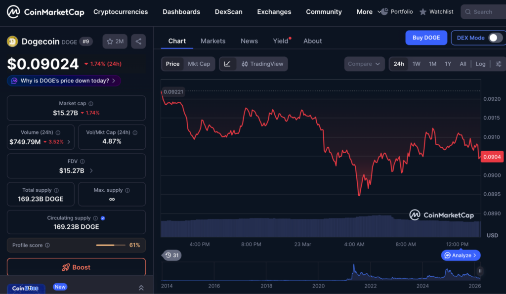 ในขณะที่รายงาน ราคา Dogecoin ซื้อขายอยู่ที่ประมาณ 0.09030 ดอลลาร์ ลดลง 1.74% ในช่วง 24 ชั่วโมงที่ผ่านมา ตามข้อมูลจาก CoinMarketCap