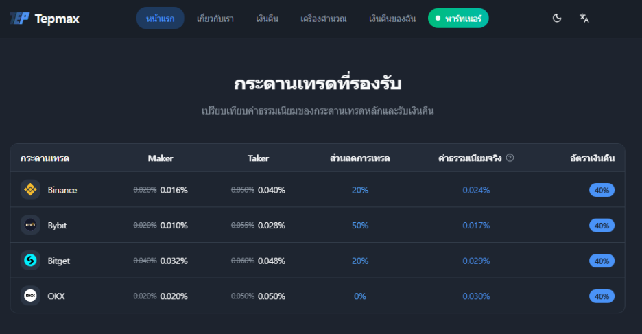 ตัวแทนจาก Tepmax กล่าวว่า “ผู้ใช้งานไม่จำเป็นต้องทำขั้นตอนการยื่นเรื่องขอคืนเงินแยกต่างหาก” และ “ระบบคำนวณอัตโนมัติที่ทำงานตลอด 24 ชั่วโมงโดยไม่มีวันหยุด จะช่วยเพิ่มประสิทธิภาพในการทำกำไรของนักเทรดได้อย่างก้าวกระโดด”
