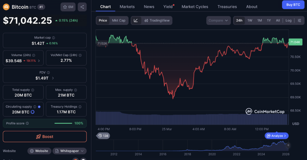 ในขณะที่รายงาน Bitcoin มีการซื้อขายกันอยู่ที่ $71,042 เพิ่มขึ้น 0.15% ในช่วง 24 ชั่วโมงที่ผ่านมา แต่ยังคงปรับตัวลงกว่า 40% จากจุดสูงสุดตลอดกาลที่ $126,198.07 ตามข้อมูลจาก CoinMarketCap