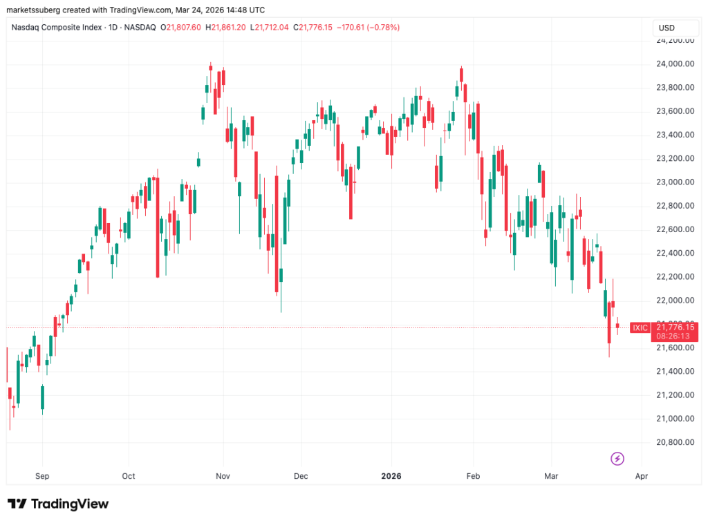 ทำให้สูญเสียโมเมนตัมที่เคยพุ่งไปแตะ 71,800 ดอลลาร์สหรัฐในช่วงต้นสัปดาห์ ในขณะที่ตลาดหุ้นสหรัฐฯ ก็เปิดตลาดในแดนลบเช่นกัน โดยดัชนี Nasdaq Composite ร่วงลงเกือบ 1% ส่วนราคาทองคำไม่สามารถทะลุผ่านแนวต้านที่ 4,450 ดอลลาร์สหรัฐไปได้