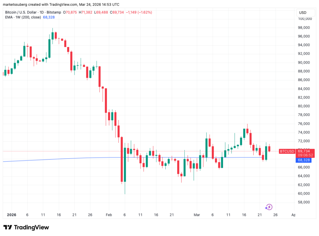 ราคา Bitcoin (BTC) ร่วงลงหลุดระดับ 70,000 ดอลลาร์สหรัฐเมื่อวันอังคารที่ผ่านมาในช่วงเปิดตลาดวอลล์สตรีท เนื่องจากความกังวลเกี่ยวกับสถานการณ์สงครามในอิหร่านได้ฉุดรั้งสินทรัพย์ระดับมหภาคให้ร่วงลงทั้งกระดาน ข้อมูลจาก TradingView เผยให้เห็นว่าราคา BTC ลดลงประมาณ 1.5% ภายในวันเดียว