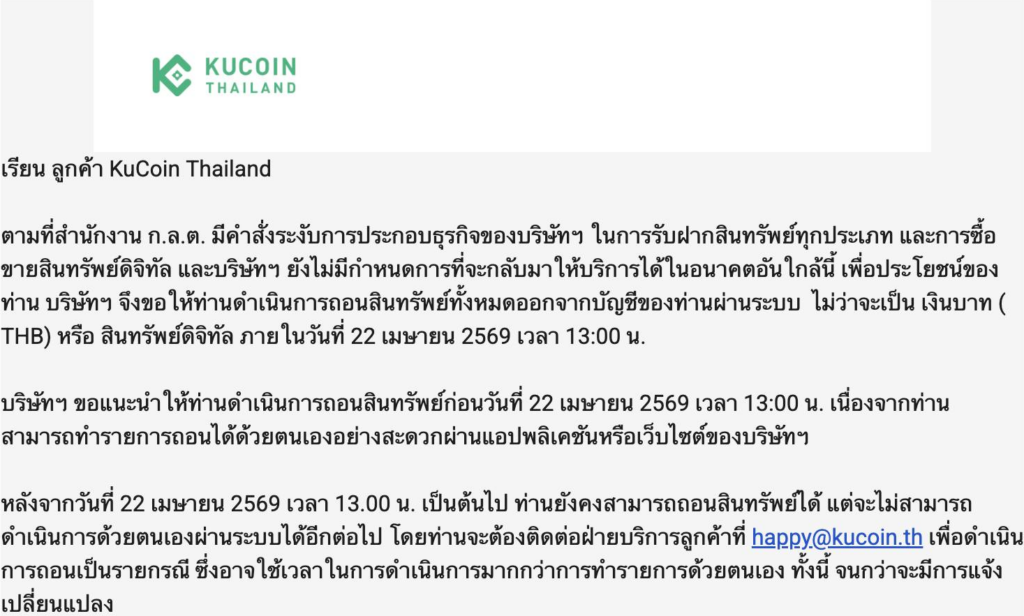 - KuCoin Thailand ร่อนอีเมลแจ้งให้ลูกค้าเร่งทำการถอนสินทรัพย์ภายในวันที่ 22 เม.ย.