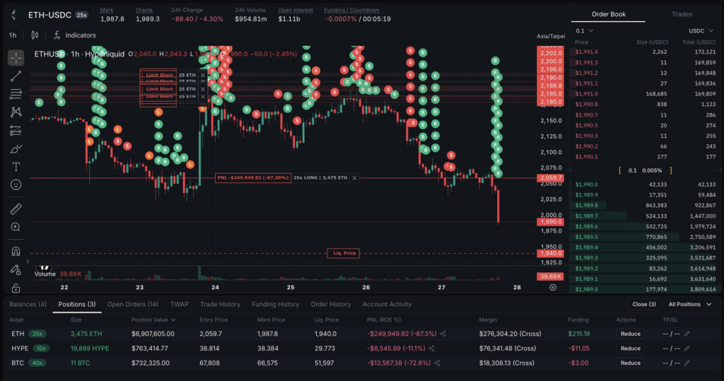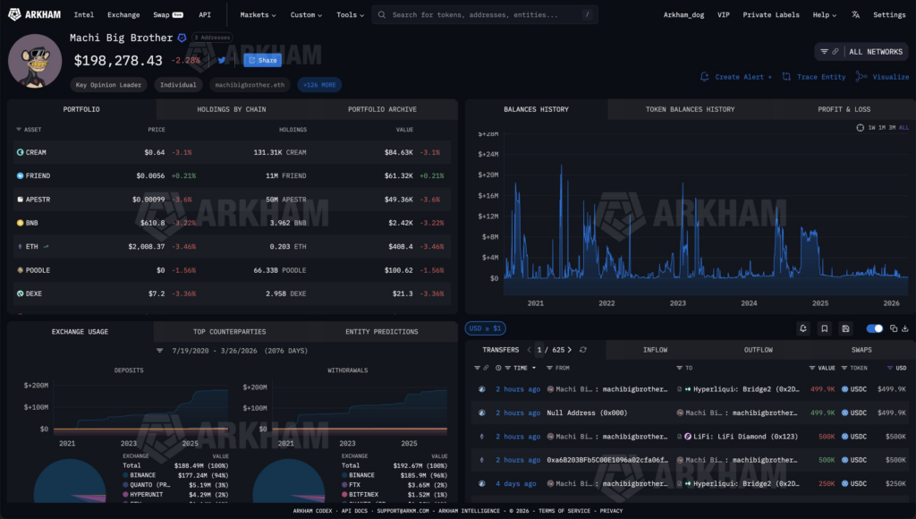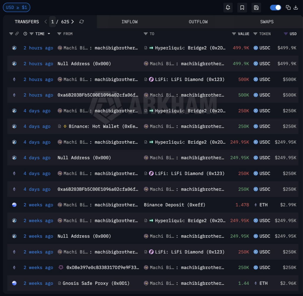 แพลตฟอร์มวิเคราะห์ข้อมูลบนบล็อกเชน Arkham ได้รายงานพฤติกรรมการเทรดที่น่าจับตามองของ “Machi Big Brother” หรือ Jeffrey Huang นักลงทุนรายใหญ่ชาวไต้หวัน ซึ่งปัจจุบันกำลังเผชิญกับยอดขาดทุนสะสม (Drawdown) จากจุดที่เคยทำกำไรสูงสุดถึง 75.87 ล้านดอลลาร์สหรัฐ (ประมาณ 2.65 พันล้านบาท) บนแพลตฟอร์ม Hyperliquid