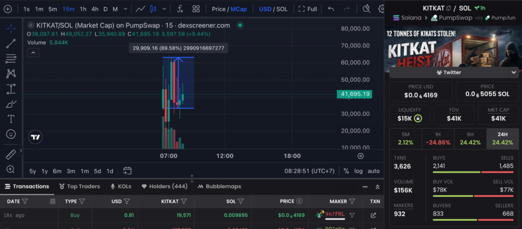 เช้าวันนี้ (30 มี.ค.) นักลงทุนสายซิ่งแห่กันเข้าไปเก็งกำไรเหรียญมีมชื่อว่า “KITKAT” บนเครือข่าย Solana จนราคาพุ่งทะยานเฉียด 90% ชั่วคราวก่อนที่ราคาจะถูกเทขายร่วงลงมาตามระเบียบ
