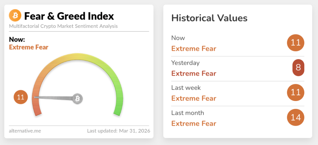 ในขณะที่ดัชนี Crypto Fear & Greed Index ดิ่งลงมาอยู่ที่ระดับ 11 ตัวเลขนี้ต่ำที่สุดในรอบหลายสัปดาห์ สะท้อนถึงสภาวะความกลัวสุดขีดของผู้คนในตลาด ที่เริ่มขาดความเชื่อมั่น และชะลอการเข้าถือครองสินทรัพย์
