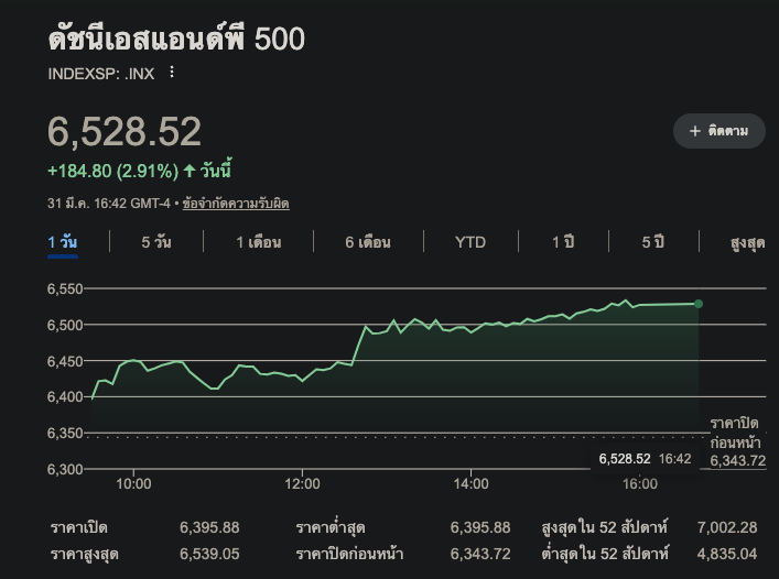 ความหวังจากกลยุทธ์ TACO ทำให้เม็ดเงินไหลเข้าตลาดอย่างถล่มทลาย นักลงทุนแห่เทเงินเข้าซื้อสินทรัพย์แทบทุกประเภท ไม่ว่าจะเป็น หุ้น, ทองคำ, Bitcoin หรือแม้แต่พันธบัตรรัฐบาล จนดัชนีหลักทั้งสี่ของสหรัฐฯ ปิดตลาดด้วยการ พุ่งขึ้นทะลุ 2% กันถ้วนหน้า