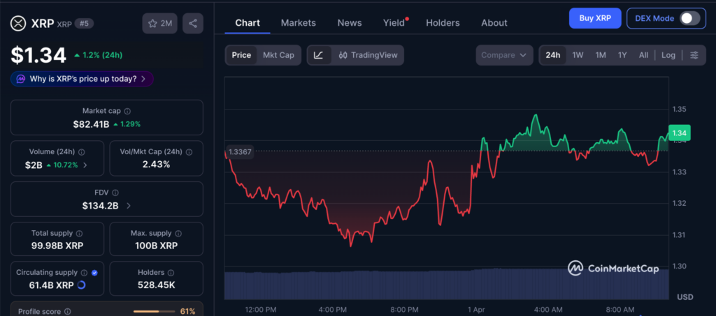 ท่ามกลางข่าวดีด้านพื้นฐาน ราคา XRP กลับเคลื่อนไหวอย่างอ่อนแรง โดยซื้อขายอยู่ที่ระดับ $1.34 ราคาเพิ่มขึ้นเพียงเล็กน้อย 1.2% ในช่วง 24 ชั่วโมงที่ผ่านมา และยังห่างไกลจากจุดสูงสุดเดิมที่ $1.60 เมื่อช่วงกลางเดือนมีนาคมที่ผ่านมา