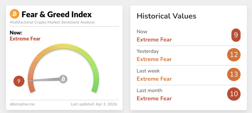 ดัชนีความกลัวและความโลภ (Fear & Greed Index) อยู่ที่ระดับ 9 หรือ “Extreme Fear” สะท้อนว่าตลาดอยู่ในภาวะตื่นตระหนกอย่างรุนแรง