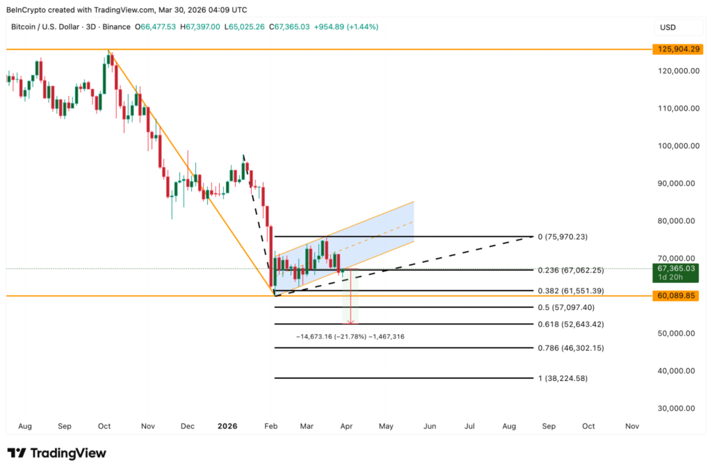 แนวรับที่สำคัญที่สุดสำหรับเดือนเมษายนอยู่ที่ $67,000 ซึ่งเป็นฐานรองรับที่แข็งแกร่งมาตลอดปี 2026 แต่หากราคาปิดต่ำกว่า $67,000 ติดต่อกัน 3 วัน ประกอบกับข้อมูลกองทุน Bitcoin ETF และพฤติกรรมของเจ้ามือที่อ่อนแรงลง อาจเป็นตัวจุดชนวนให้เกิดการร่วงรอบต่อไป