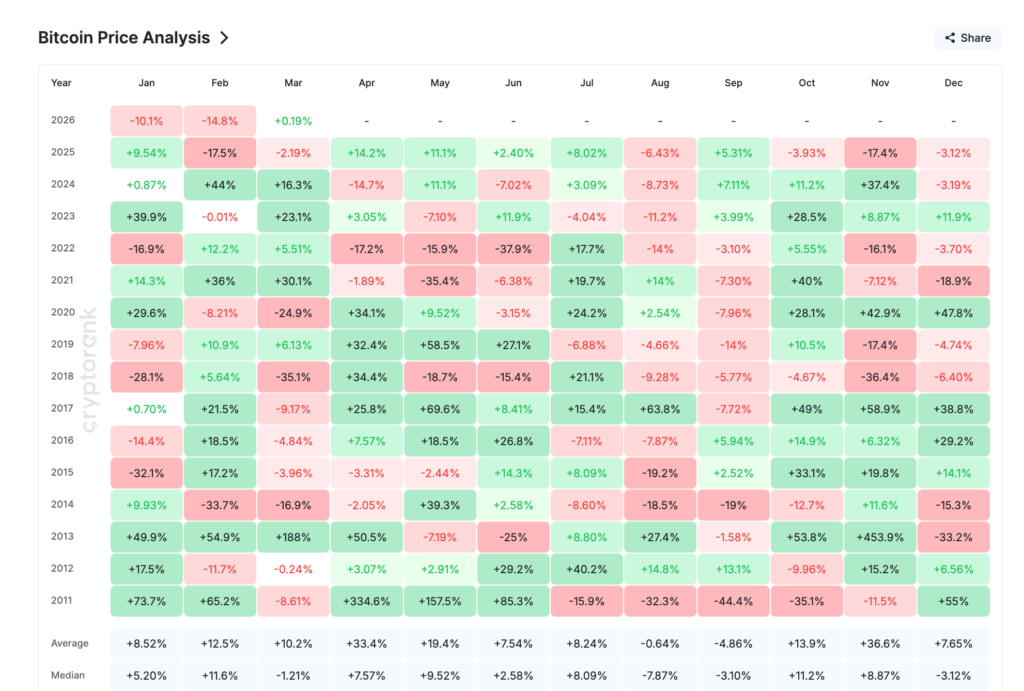 สถิติในปัจจุบันเผยให้เห็นว่าราคา Bitcoin ดิ้นรนมาตลอดปี 2026 โดยเดือนมกราคมร่วง -10.1% และกุมภาพันธ์ดิ่ง -14.8% ซึ่งสวนทางกับค่าเฉลี่ยในอดีตที่เคยเป็นบวก +8.52% และ +12.5% ตามลำดับ ส่วนเดือนมีนาคม ราคาแทบไม่ขยับโดยบวกเพียง +0.19% เทียบกับค่าเฉลี่ยในอดีตที่ +10.2%