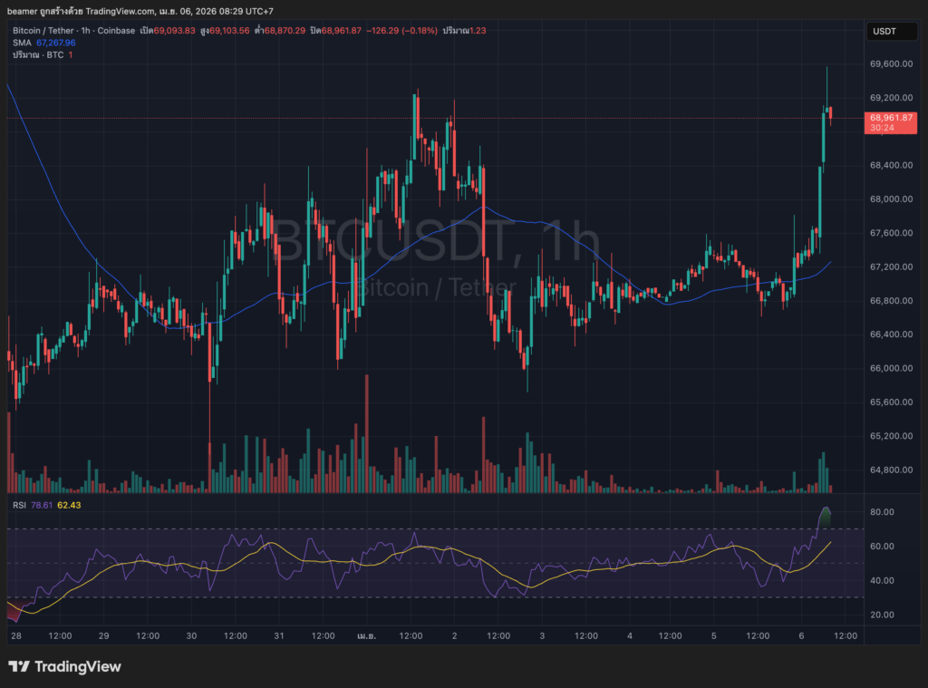 ราคา Bitcoin (BTC) พุ่งขึ้นแรงในวันที่ 6 เม.ย. 2569 โดยทะลุแตะ $68,855 คิดเป็นการขึ้นกว่า 2.53% ในรอบ 24 ชั่วโมง จากจุดต่ำสุดที่ $66,634 ไปจนถึงจุดสูงสุดในวันที่ $69,328 ซึ่งนับเป็นการดีดตัวที่มีพลังมากที่สุดในรอบหลายวันและทำให้ราคาเข้าใกล้ระดับจิตวิทยา $70,000 อีกครั้ง การเคลื่อนไหวครั้งนี้ไม่ได้หยุดอยู่แค่ Bitcoin เพียงเหรียญเดียว แต่ส่งแรงกระเพื่อมออกไปทั่วระบบนิเวศคริปโตอย่างรวดเร็ว