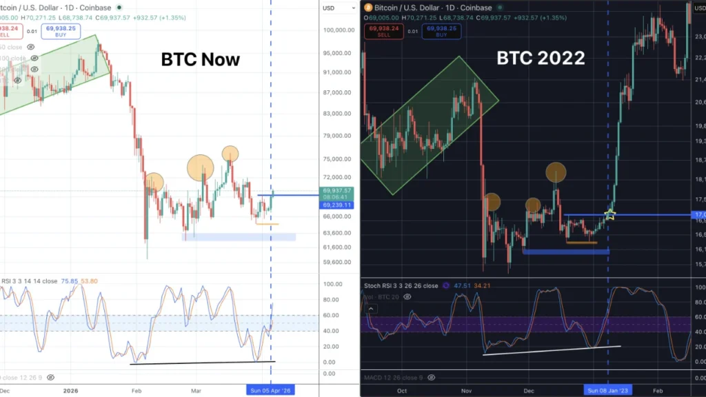 แม้ Stoch RSI จะเคลื่อนที่ระหว่างสองโซนนี้เร็วกว่า RSI ปกติ แต่ Quantum Ascend มองเห็นสัญญาณขาขึ้นระยะยาวที่กำลังก่อตัว โดยเขาระบุว่า RSI บนกราฟรายวันอยู่ในจุดเดียวกับปี 2022 อย่างพอดิบพอดี กราฟเปรียบเทียบแสดงให้เห็นว่า Stoch RSI ทำรูปแบบ Double Bottom สอดคล้องกับโครงสร้างราคา ก่อนที่ทั้งสองส่วนจะปรับตัวพุ่งขึ้นในช่วงต้นปี 2023 ซึ่งในเวลานั้นราคา BTC/USD เพิ่งทำจุดต่ำสุดในรอบหลายปีที่ระดับ 15,600 ดอลลาร์ และได้กลายเป็นจุดต่ำสุดของตลาดหมีในรอบนั้น
