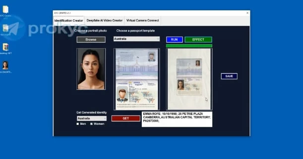 เครื่องมือนี้มีความสามารถในการสร้างใบหน้าบุคคลที่ไม่มีอยู่จริงขึ้นมา พร้อมทั้งสร้างวิดีโอ Deepfake และภาพถ่ายคู่กับเอกสารประจำตัวปลอม เช่น พาสปอร์ตหรือใบขับขี่ เพื่อหลอกระบบตรวจจับใบหน้า (Facial Recognition) โดยรายงานระบุว่า ProKYC สามารถผ่านขั้นตอนตรวจสอบของเว็บเทรดชื่อดังอย่าง Bybit มาแล้ว รวมถึงแพลตฟอร์มชื่อดังอย่าง Stripe และ Revolut