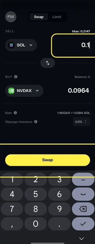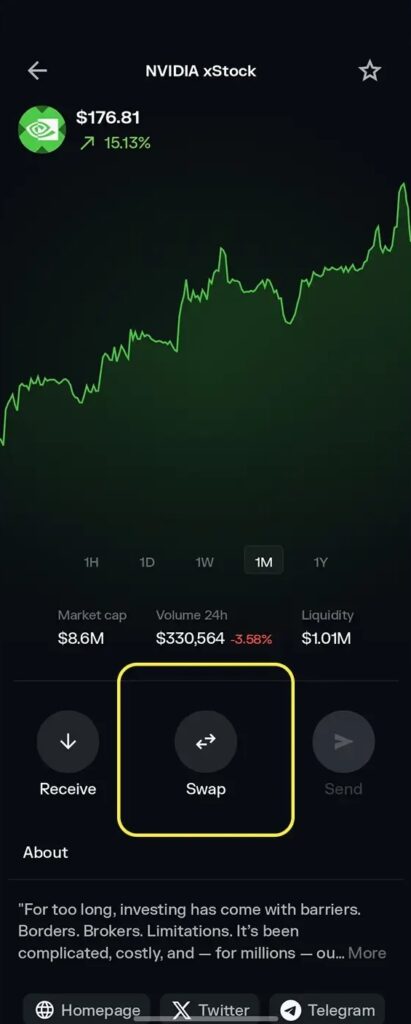 เมื่อเจอหุ้นที่สนใจแล้วนักเทรดก็สามารถเข้าไปดูข้อมูลได้ก่อนเช่นกราฟราคา วอลุ่มเทรด สภาพคล่อง และถ้าดูแล้วยังสนใจก็สามารถกดปุ่ม Swap ที่ด้านล่าง ระบบจะทำการแลกเปลี่ยนคริปโตกับหุ้นให้โดยอัตโนมัติตามที่ระบุ โดยให้ผู้ใช้กดยืนยัน ก็เป็นอันเสร็จสิ้นและจะมีการเก็บค่าธรรมเนียมเล็กน้อยในระหว่างธุรกรรม