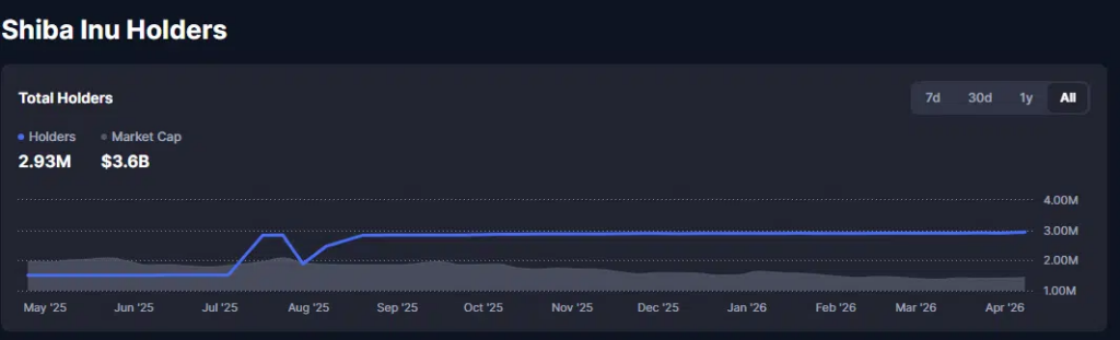 รายงานล่าสุดชี้ให้เห็นถึงจำนวนผู้ถือครองเหรียญที่เพิ่มขึ้นอย่างสม่ำเสมอ โดยมี Wallet ใหม่เพิ่มเข้ามาประมาณ 5,000 ถึง 12,000 บัญชีในแต่ละเดือน การหลั่งไหลเข้ามาของผู้ใช้งานกลุ่มนี้มักจะเป็นตัวนำร่องไปสู่การเพิ่มขึ้นของ Network Activity ซึ่งในระยะยาวจะส่งผลดีต่อราคาอย่างมีนัยสำคัญ ข้อมูลดังกล่าวยืนยันถึงการเติบโตอย่างต่อเนื่อง โดยปัจจุบันจำนวนผู้ถือครอง SHIB เพิ่มขึ้นเกือบเท่าตัวจาก 1.5 ล้านบัญชีเมื่อปีที่แล้ว มาเป็น 2.93 ล้านบัญชีในปัจจุบัน สิ่งนี้แสดงให้เห็นถึงแรงดึงดูดที่ยังคงเหนียวแน่นแม้ว่าราคาเหรียญจะร่วงลงไปถึง 45.8% ในช่วงเวลาเดียวกันก็ตาม