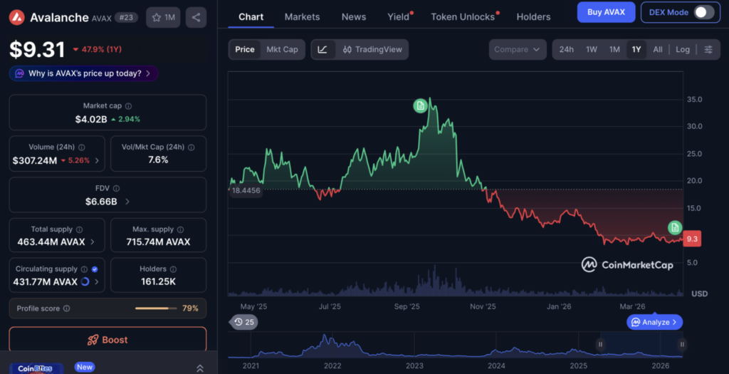 ในขณะที่รายงาน AVAX มีการซื้อขายกันอยู่ที่ $9.31 ลดลง 47.9% ตลอดช่วง 1 ปีที่ผ่านมา ตามข้อมูลจาก CoinMarketCap