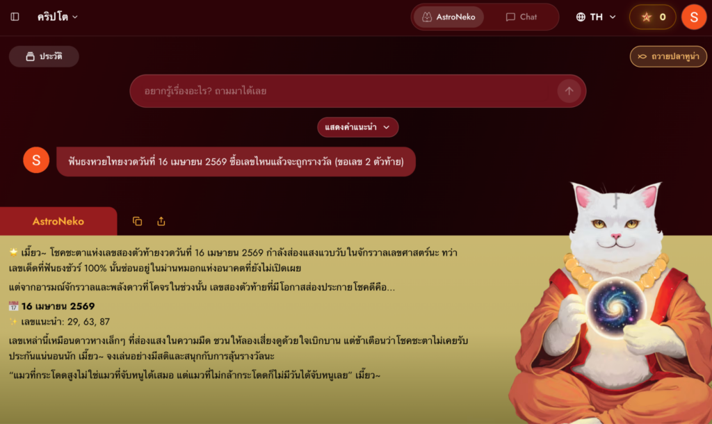 วันนี้ Siam Blockchain ขอพักเรื่องคริปโตไว้ชั่วคราว แล้วพาทุกคนเข้าสู่วงการตัวเลขแห่งความหวังด้วยการจับ AI สัญชาติไทยชื่อดังอย่าง AstroNeko ที่ขึ้นชื่อเรื่องความแม่นยำในการทำนายราคา Bitcoin และทองคำมาสวมบทบาท “เจ้าพ่อใบ้หวย” ประจำงวดวันที่ 16 เมษายน 2569
