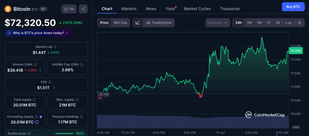 ตลาดคริปโตกลับมาเป็นสีเขียวอีกครั้ง หลังราคา Bitcoin และ Ethereum กอดคอกันดีดตัวขึ้นอย่างรุนแรง โดยราคา Bitcoin ซื้อขายอยู่ที่ 72,320 ดอลลาร์ เพิ่มขึ้น 2.01% ภายใน 24 ชั่วโมง