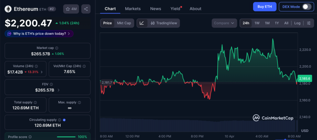ในขณะที่ราคา Ethereum ซื้อขายอยู่ที่ 2,200 ดอลลาร์ เพิ่มขึ้น 1.04% ภายใน 24 ชั่วโมง