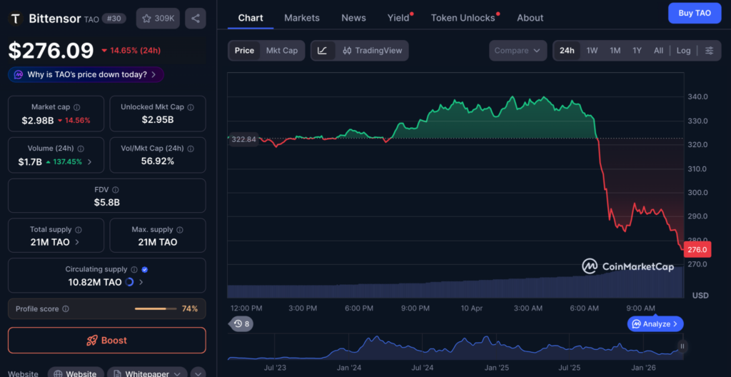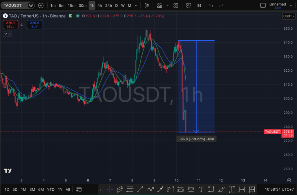 ราคาเหรียญ Bittensor (TAO) เผชิญกับแรงเทขายอย่างหนัก ส่งผลให้ราคาทรุดตัวลงเกือบ 20% โดยร่วงจากโซนเหนือระดับ $340 ลงไปทดสอบแนวรับสำคัญที่ $275 ภายในเวลาไม่กี่ชั่วโมง