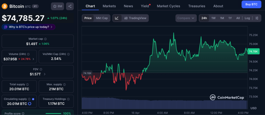 ในขณะที่รายงาน ราคา Bitcoin ซื้อขายอยู่ที่ 74,785 ดอลลาร์ เพิ่มขึ้น 1.07% ภายใน 24 ชั่วโมง อ้างอิงข้อมูลจาก coinmarketcap