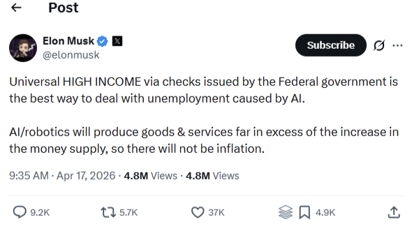 ล่าสุด Elon Musk ได้ออกมาสนับสนุนแนวคิดระบบรายได้พื้นฐานระดับสูงถ้วนหน้าหรือ Universal High Income บนแพลตฟอร์ม X โดยผลักดันให้รัฐบาลแจกเงินให้กับประชาชนในอนาคต เพื่อรับมือกับวิกฤตคนตกงานจำนวนมากที่เกิดจากการเข้ามาแทนที่ของ AI